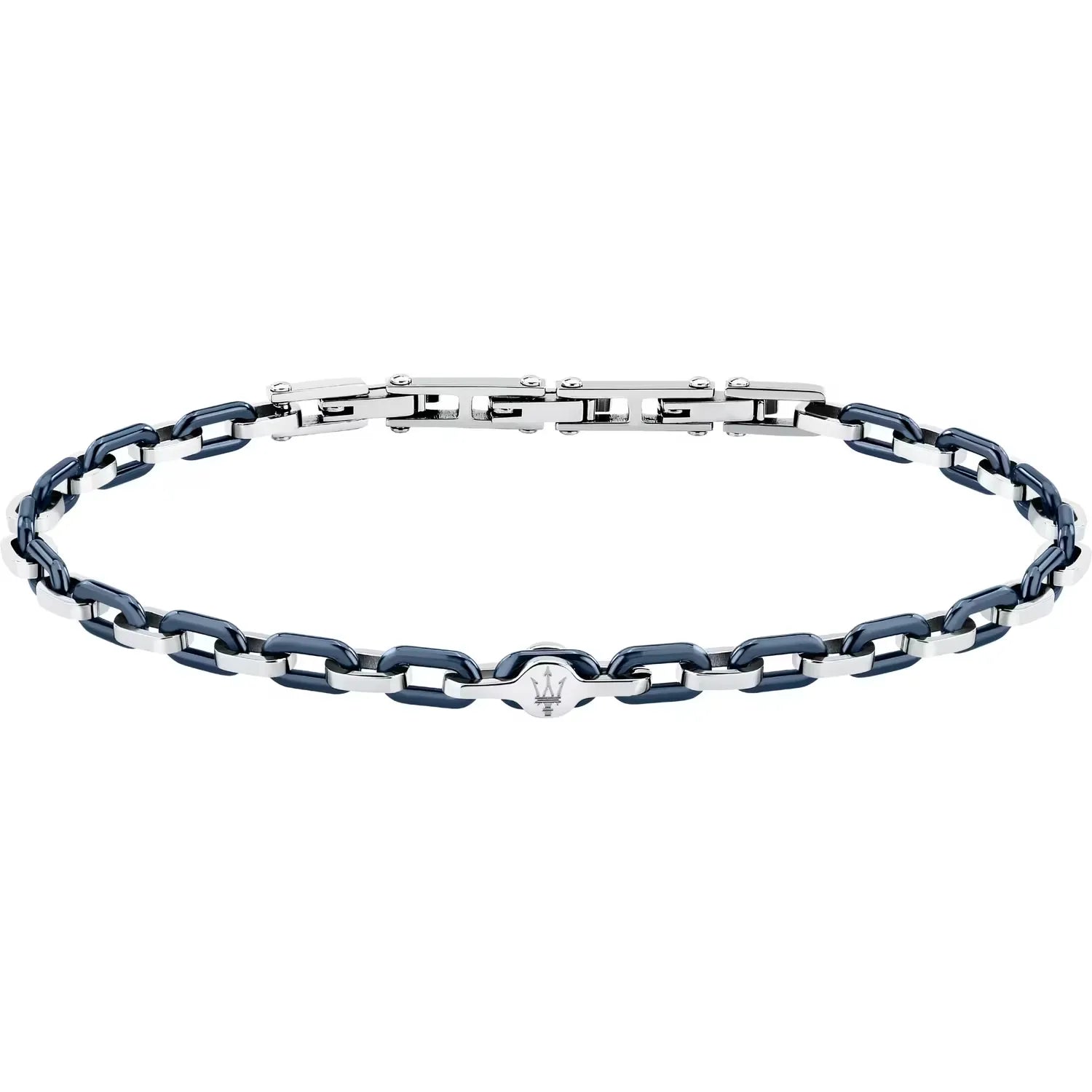 Il bracciale è costruito in acciaio inossidabile di alta qualità, resistente e anallergico, con finitura silver brillante. Gli elementi della catena sono alternati a inserti in pregiata ceramica blu, un materiale tecnico noto per la sua lucentezza inalterabile e l'elevata resistenza ai graffi. Al centro del design spicca l'iconico logo del Tridente Maserati, finemente inciso, che firma il gioiello con prestigio e autorità. La misura di 19 cm è estendibile fino a 22 cm grazie a una pratica estensione di 3 cm, garantendo una perfetta adattabilità a ogni polso maschile. Il peso di 8,600 gr assicura una sensazione di solidità e importanza, senza compromettere il comfort necessario per l'uso quotidiano. La chiusura a moschettone è robusta e personalizzata, progettata per offrire sicurezza massima e facilità di indosso. Viene fornito con certificato di autenticità e presentato nella confezione originale Maserati.