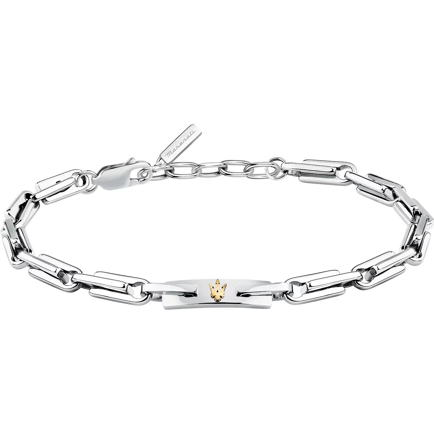 Bracciale Maserati Iconic JM425AVD108 da uomo in acciaio color silver. Misura 19,5+3 cm. Design a maglie con piastrina centrale e Tridente Maserati dorato. Acquista ora il tuo bracciale Maserati.