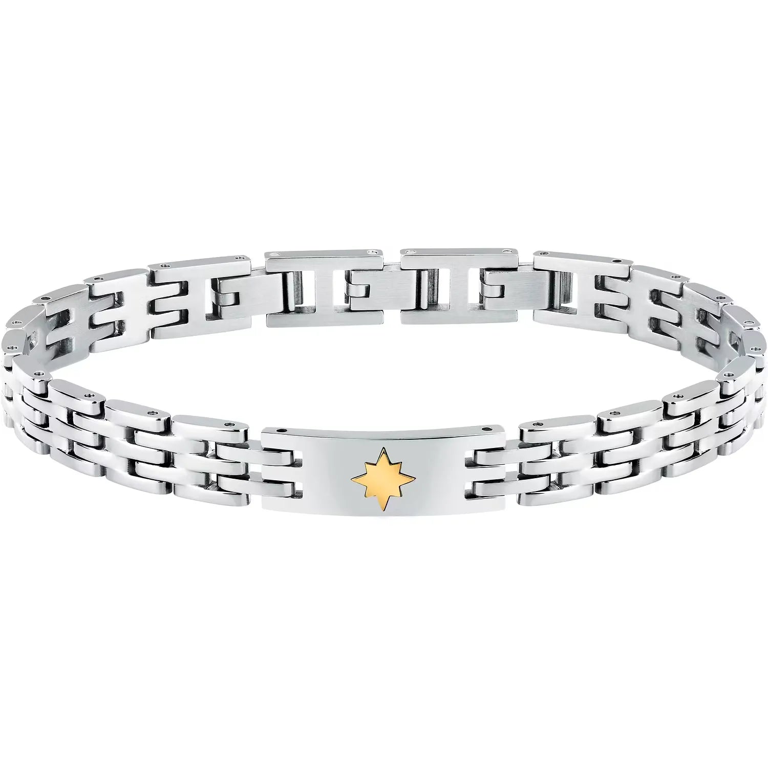 Questo bracciale da uomo Morellato della collezione Gold è un accessorio dallo stile distintivo e robusto. Realizzato in acciaio bicolore, combina elementi color argento con un dettaglio centrale color oro a forma di stella, un simbolo di aspirazione e unicità. Con un peso di 27,800 grammi, offre una sensazione di solidità al polso. L'autenticità del prodotto è garantita dal certificato incluso e dalla confezione originale Morellato. Un gioiello ideale per l'uomo che ama gli accessori dal design audace e significativo.