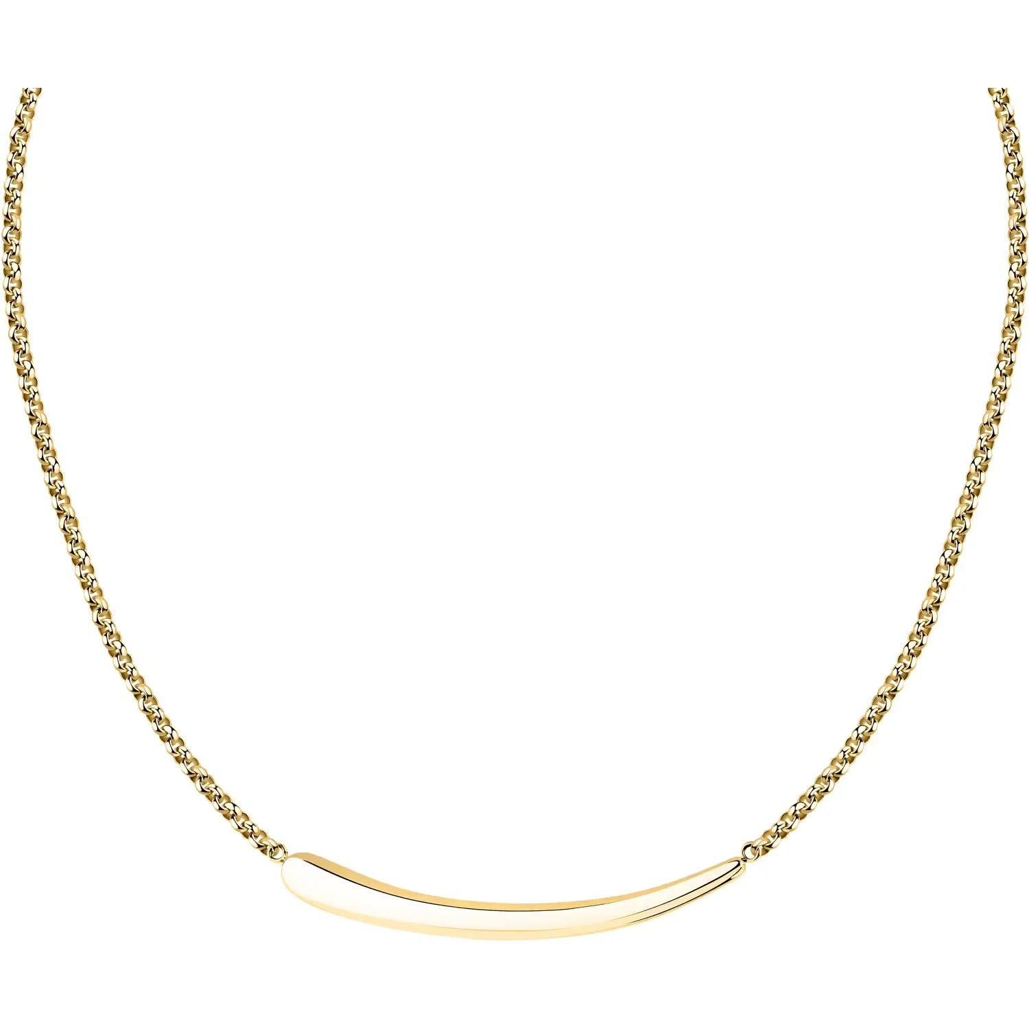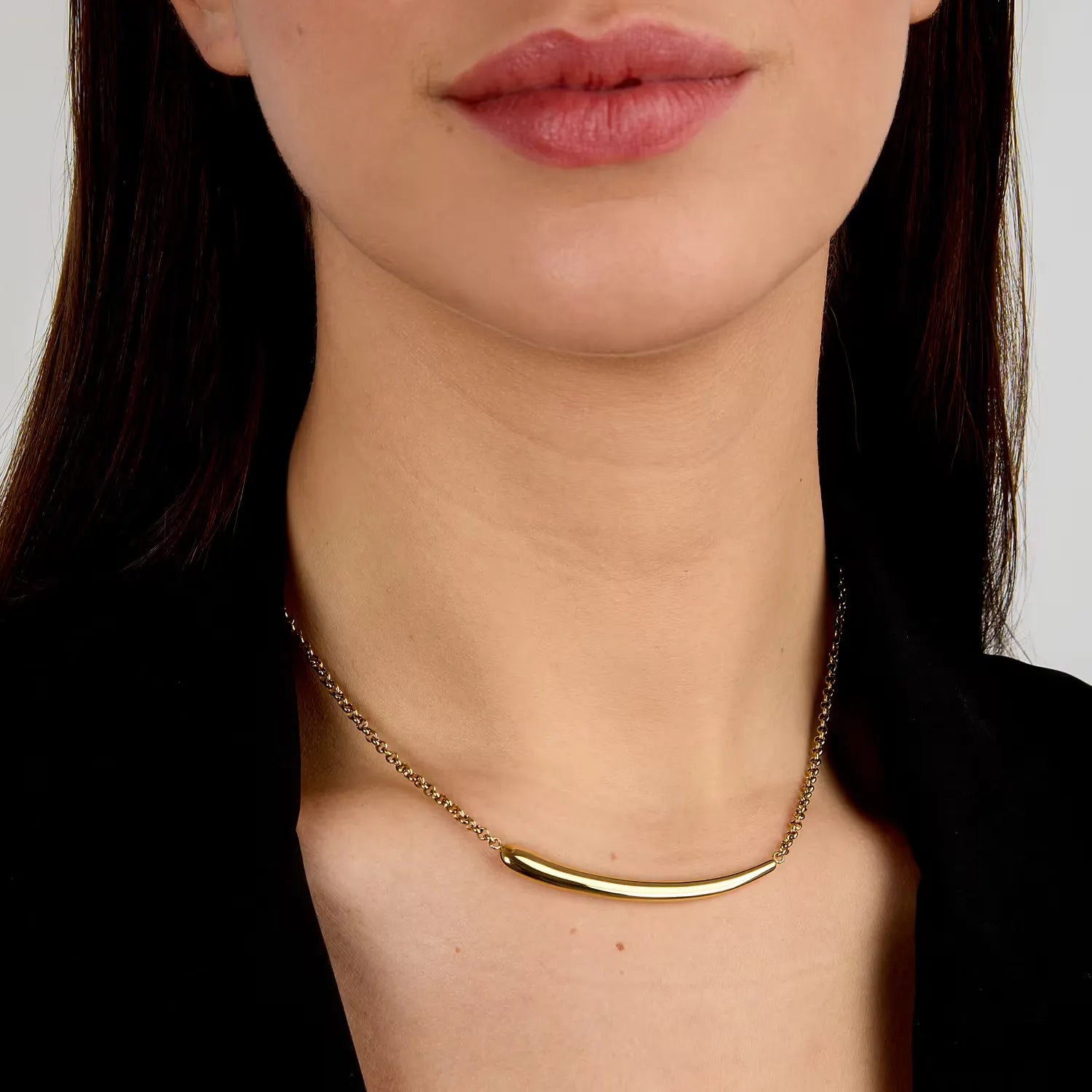 La collana è interamente realizzata in acciaio colore oro e presenta un design a barra lucida curva, che si integra armoniosamente con la catena a maglie sottili.