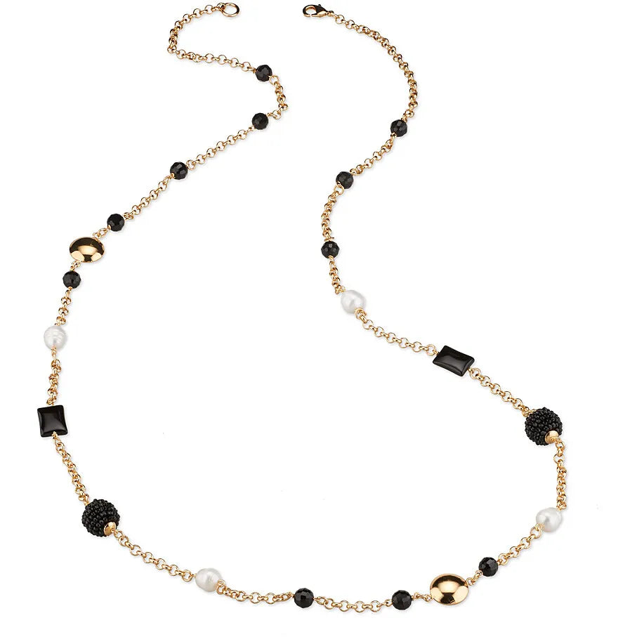 Collana da donna di Sovrani della collezione Cristal Magique. Collana in ottone con finitura in oro e con onice, perla di fiume, cristalli neri e more di cristallo nero. Lunghezza: cm 104. Chiusura a moschettone. La referenza è: J10143