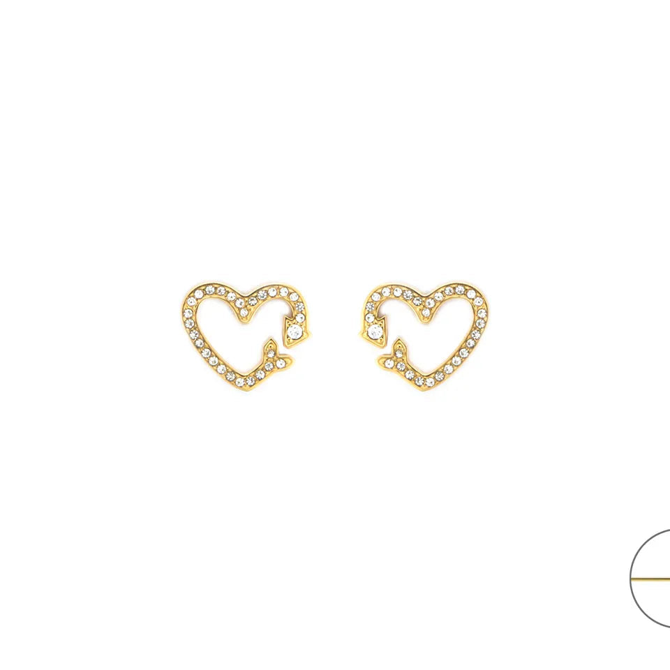 Questi orecchini sono di modello a lobo (come visibile nel modello in foto, con chiusura a perno). Sono realizzati in Acciaio con una preziosa finitura in PVD Oro. Il design è a forma di cuore traforato/scomposto, interamente impreziosito da un pavé di Zirconi Bianchi che catturano la luce. La chiusura è a perno e farfallina.