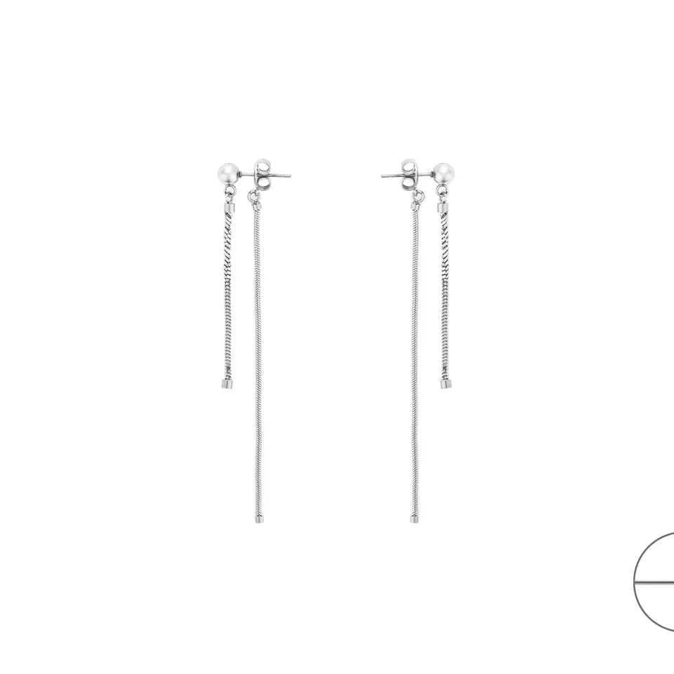 Questi orecchini sono di modello pendente corto e sono realizzati interamente in Acciaio Inossidabile (come visibile nel modello in foto, con finitura color argento). La parte superiore è una sfera a lobo, dalla quale pendono due catene di lunghezza leggermente diversa: una sottile e lineare e l'altra a maglia più lavorata. La chiusura è a perno e farfallina.