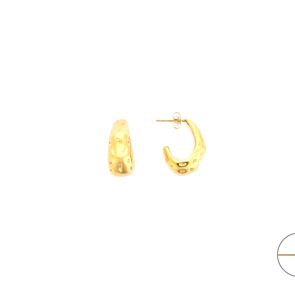 Questi orecchini a mezzaluna spessa (a cerchio aperto) sono realizzati in Acciaio con finitura PVD Oro. Il design presenta una forma irregolare e martellata/punteggiata che conferisce loro un aspetto bold e artigianale. La chiusura è a perno e farfallina.