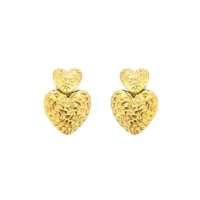Design e Stile: Gli orecchini pendenti (come si può osservare nell'immagine di riferimento) presentano una forma a doppio cuore o cuore sacro con una ricca trama intrecciata e martellata. Questa lavorazione conferisce profondità e una lucentezza unica, enfatizzando il look dorato.