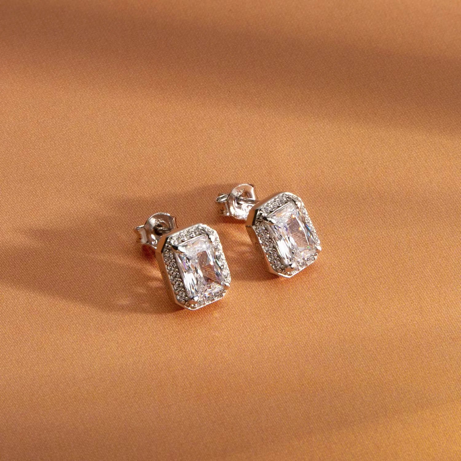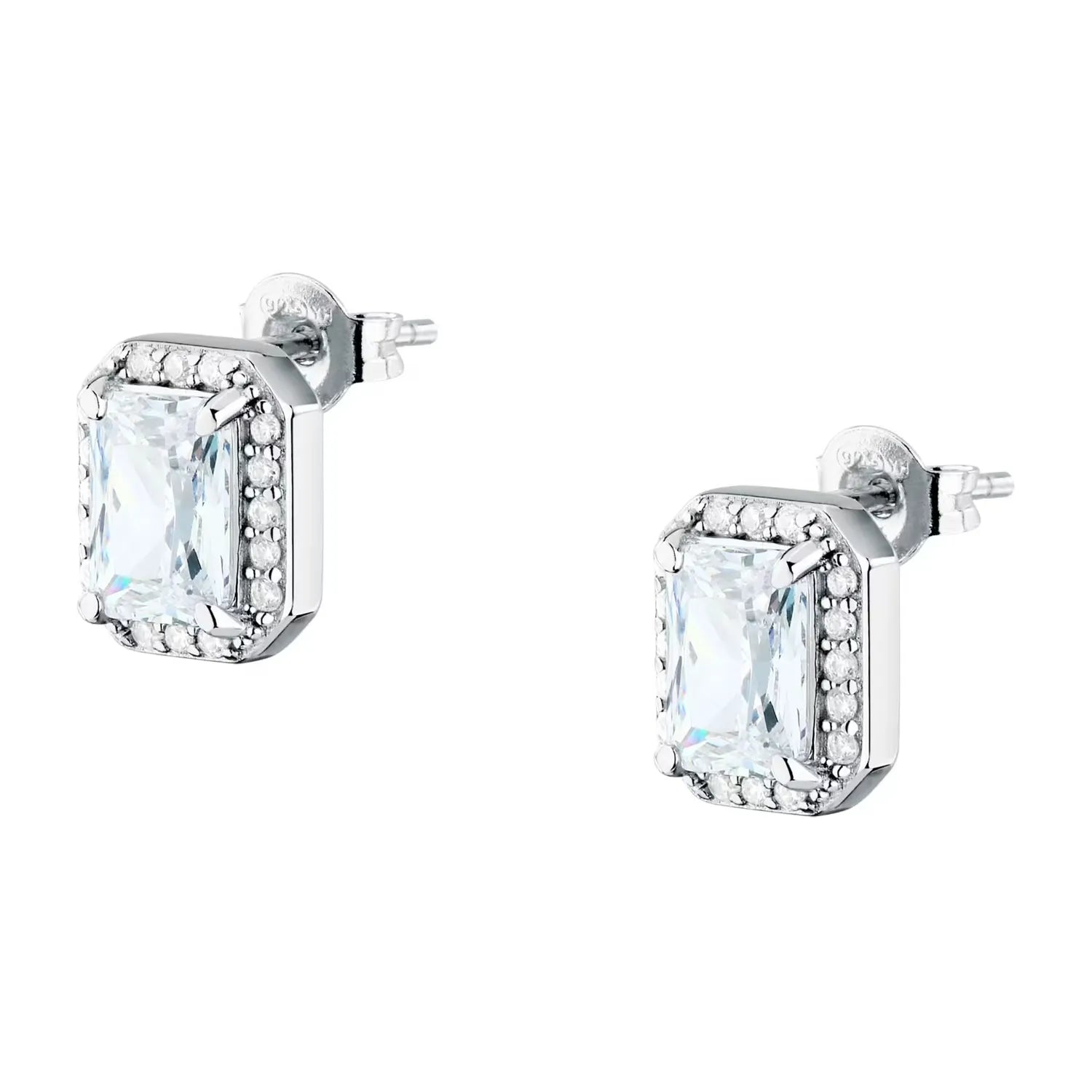 Il gioiello presenta un ricercato design a lobo con una montatura rettangolare che incornicia uno zircone centrale di eccezionale purezza. La pietra principale è valorizzata da una corona di piccoli zirconi bianchi che ne amplificano lo splendore a ogni movimento del viso. Realizzati in pregiato Argento sostenibile, questi orecchini uniscono il lusso del design italiano a un approccio produttivo responsabile. Con dimensioni di 0,8 x 1 cm, offrono le proporzioni ideali per risaltare con discrezione e classe. Il peso di 2,650 gr garantisce una vestibilità leggera e confortevole, rendendoli perfetti per un uso quotidiano prolungato. La finitura silver lucida assicura una lucentezza duratura e un'alta resistenza nel tempo.