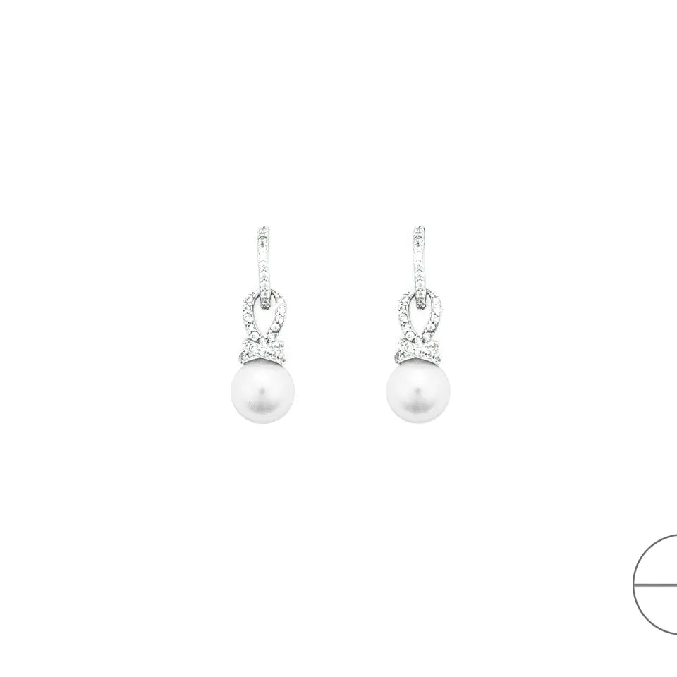 Questi orecchini sono di modello pendente e sono realizzati in Argento (come specificato nella Collezione San Valentino 25 in Argento). La parte superiore, che si fissa al lobo, è un elemento curvo/a fiocco interamente impreziosito da Zirconi Bianchi. Da questo pendono, in modo aggraziato, una Perla di circa 8mm di diametro (come da descrizione fornita) e di colore bianco lucido. La chiusura è a perno e farfallina.