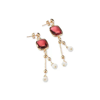 Orecchini da donna di Sovrani della collezione Cristal Magique. Orecchini in ottone con finitura in oro con agata rubya, madreperla e cristalli occhio di gatto bianco e bordeaux. Lunghezza: cm 8. Chiusura a farfallina. La referenza è: J10087