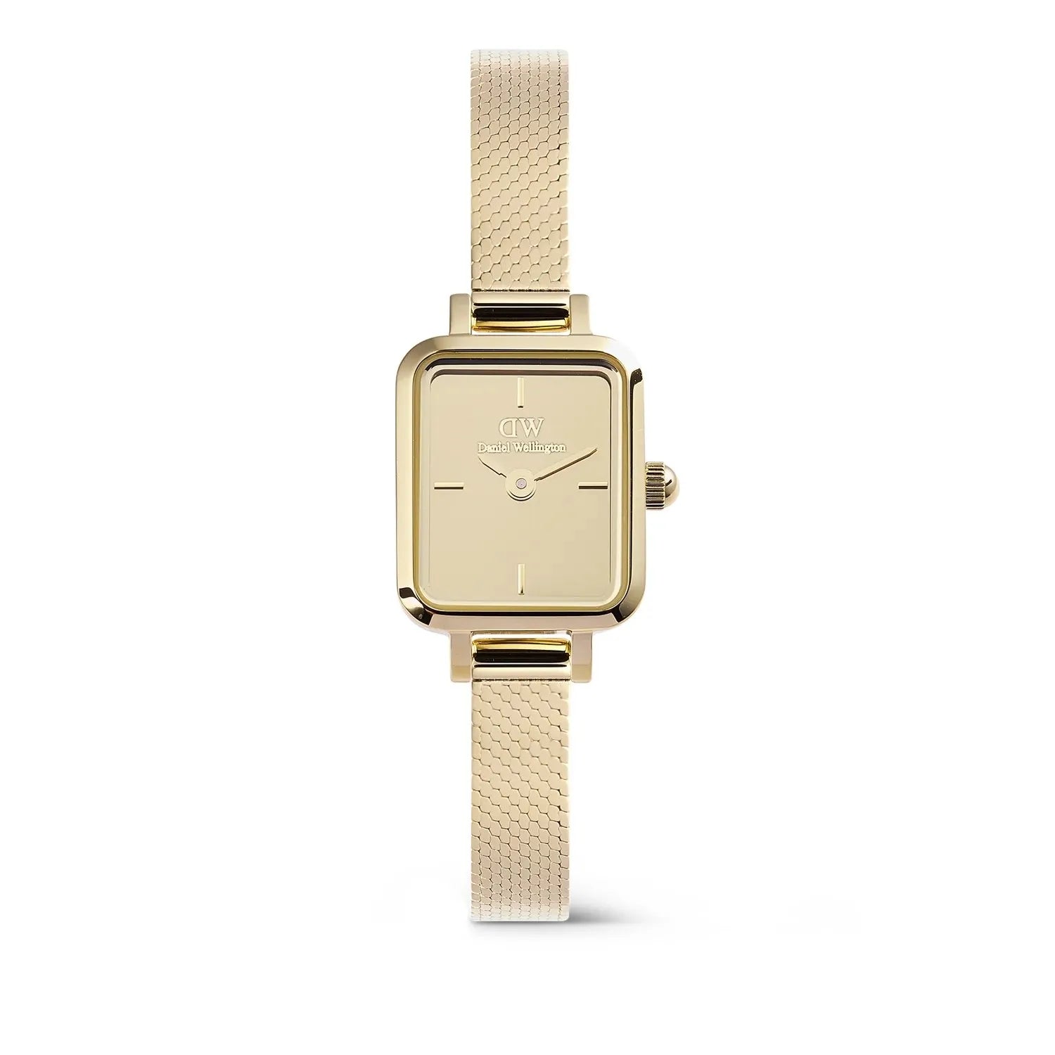 Modello: DW00100801 - Genere: Donna - Collezione: Quadro Mini - Materiale cassa e cinturino: Acciaio dorato - Misura cassa: 15.4 x 18.2 mm - Colore quadrante: Oro - Movimento: Quarzo - Funzione: Solo tempo - Water resistant: 3 ATM - Cinturino: Maglia milanese - Confezione: Originale Daniel Wellington.