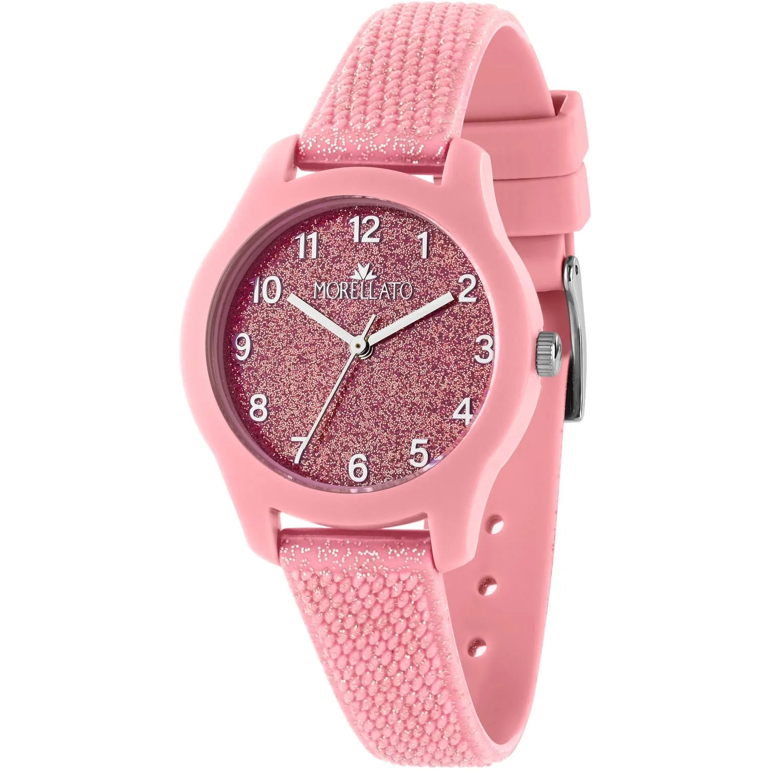 - Quadrante: Rosa glitterato con indici e lancette argentate.