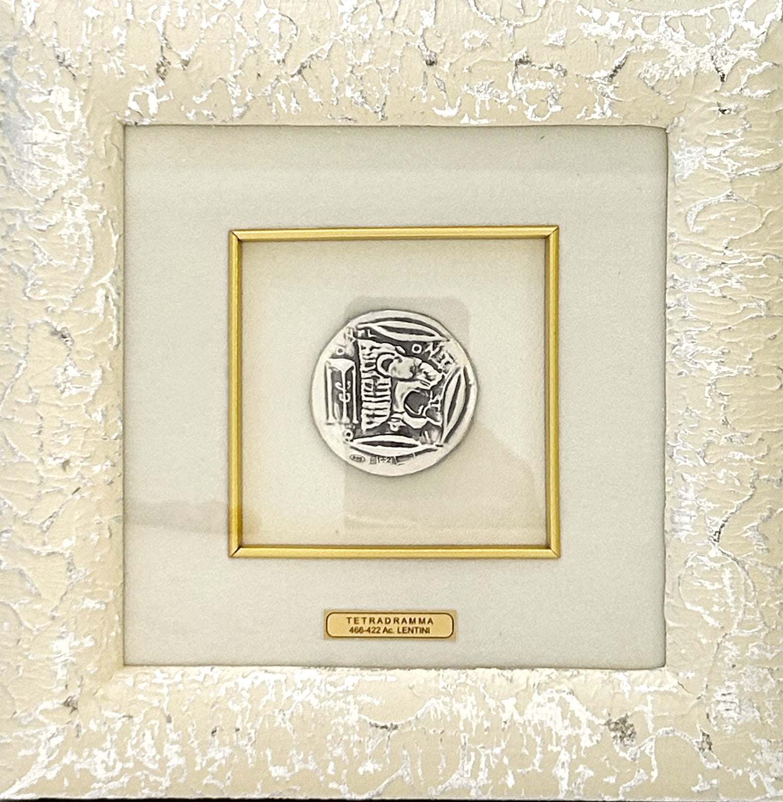 La cornice esterna ha uno stile moderno con una base bianca o avorio con una texture irregolare e sottili accenti argento, creando un effetto marmorizzato o anticato. All'interno, una cornice dorata più sottile racchiude la riproduzione della moneta su uno sfondo bianco o avorio. Sotto la moneta, all'interno della cornice dorata, si trova una piccola etichetta dorata che indica "TETRADRAMMA" e "466-422 AC LENTINI".