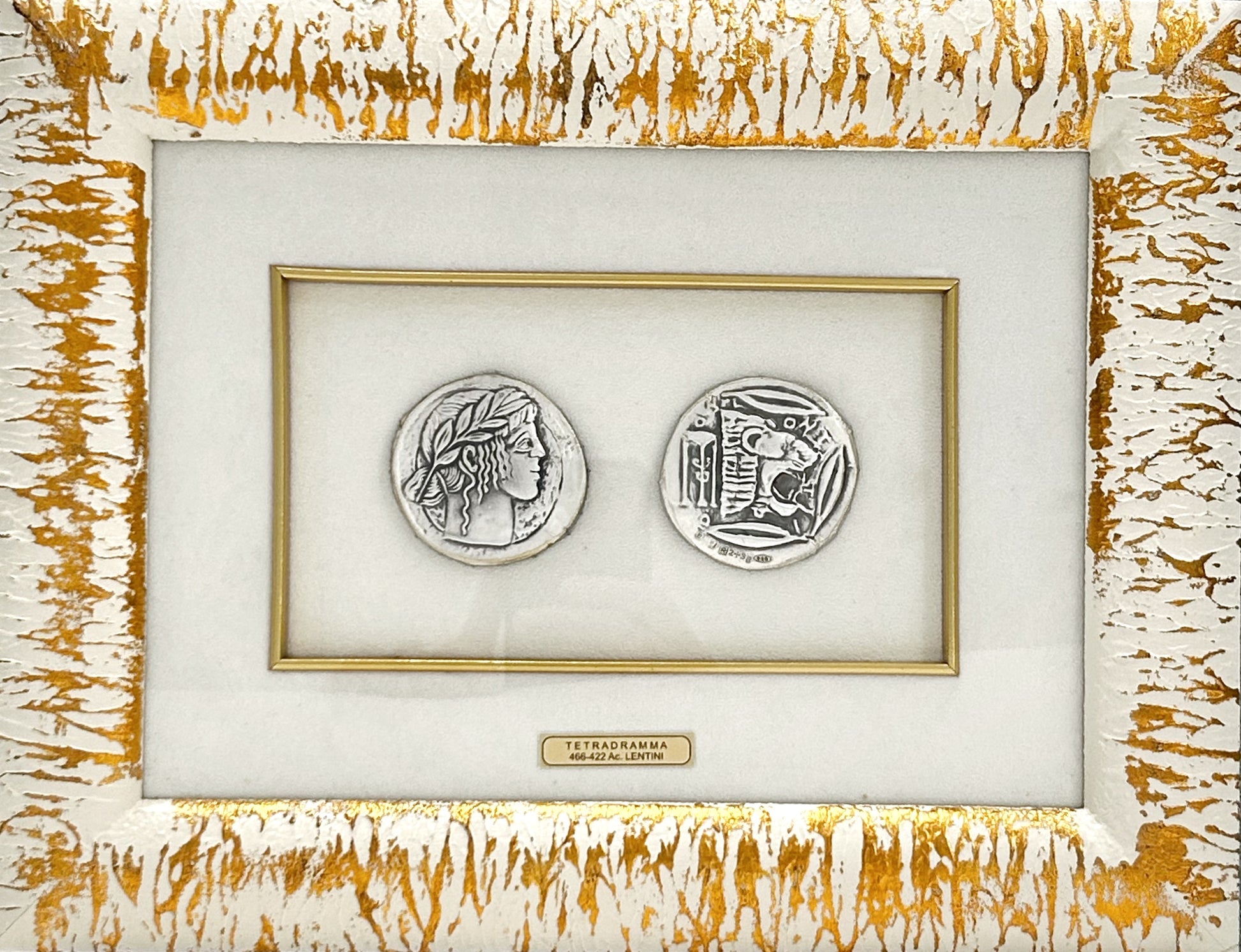 Questo è un quadro che incornicia una riproduzione di un tetradramma di Lentini. Il tetradramma è mostrato su entrambi i lati, permettendo di osservare sia il dritto che il rovescio della moneta.